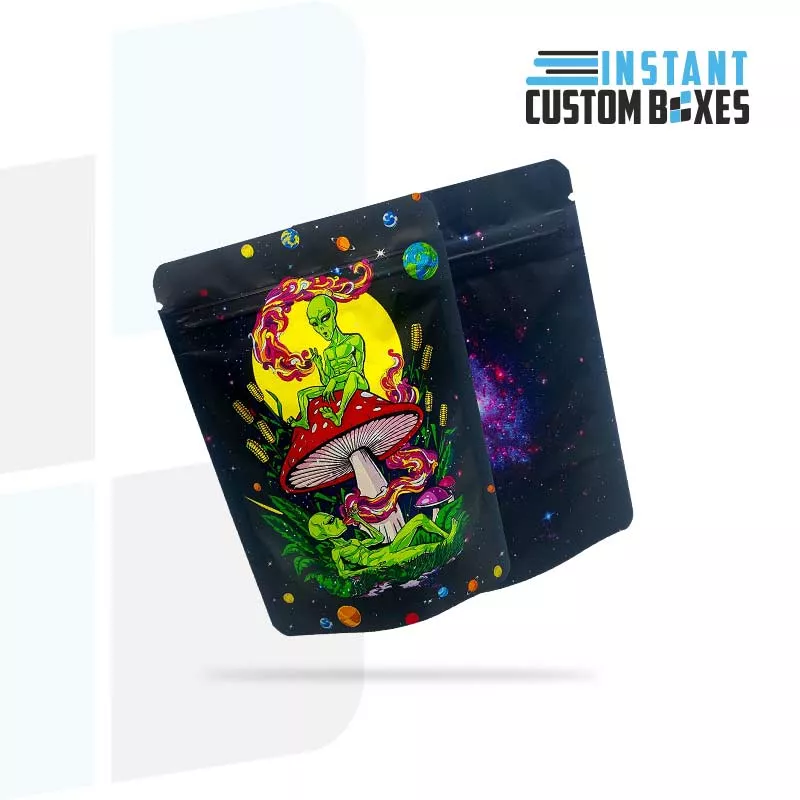 Ziplock Mylar Bags in Bulk at Instant Custom Boxes consist of two sheets of plastic sheeting, one welded (laminated) to the open end of the other sheet. A zipper (or adhesive strip) is inserted inside the seam, along with a gusseted bottom panel. The flap is formed on one side during lamination and becomes part of the seal when it is folded over to close the bag. Zipper bags are made from: